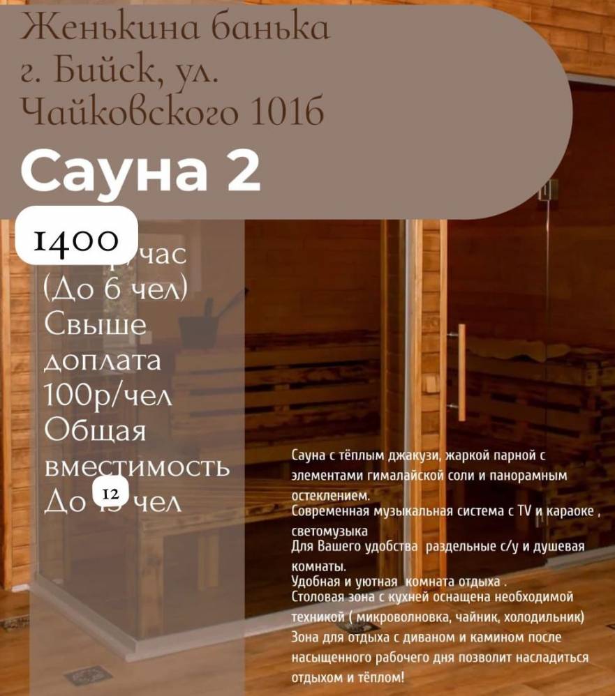 6 чел. (макс. 12 чел., свыше 6 чел. доплата 100 руб за каждый час) -